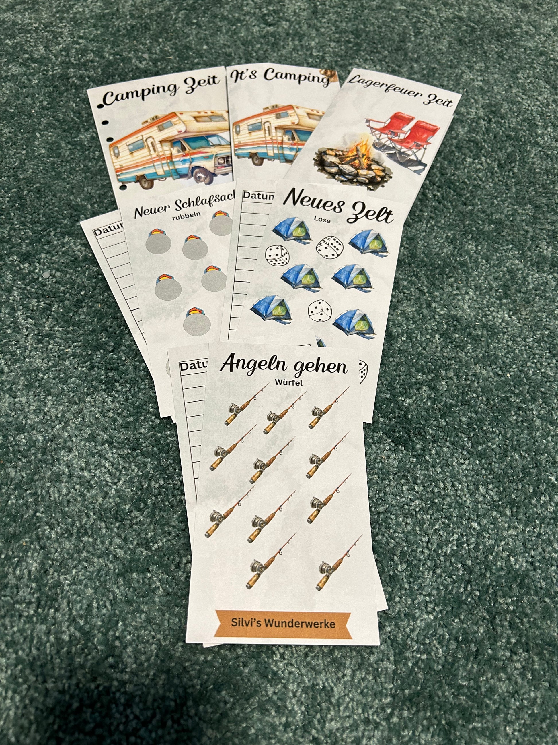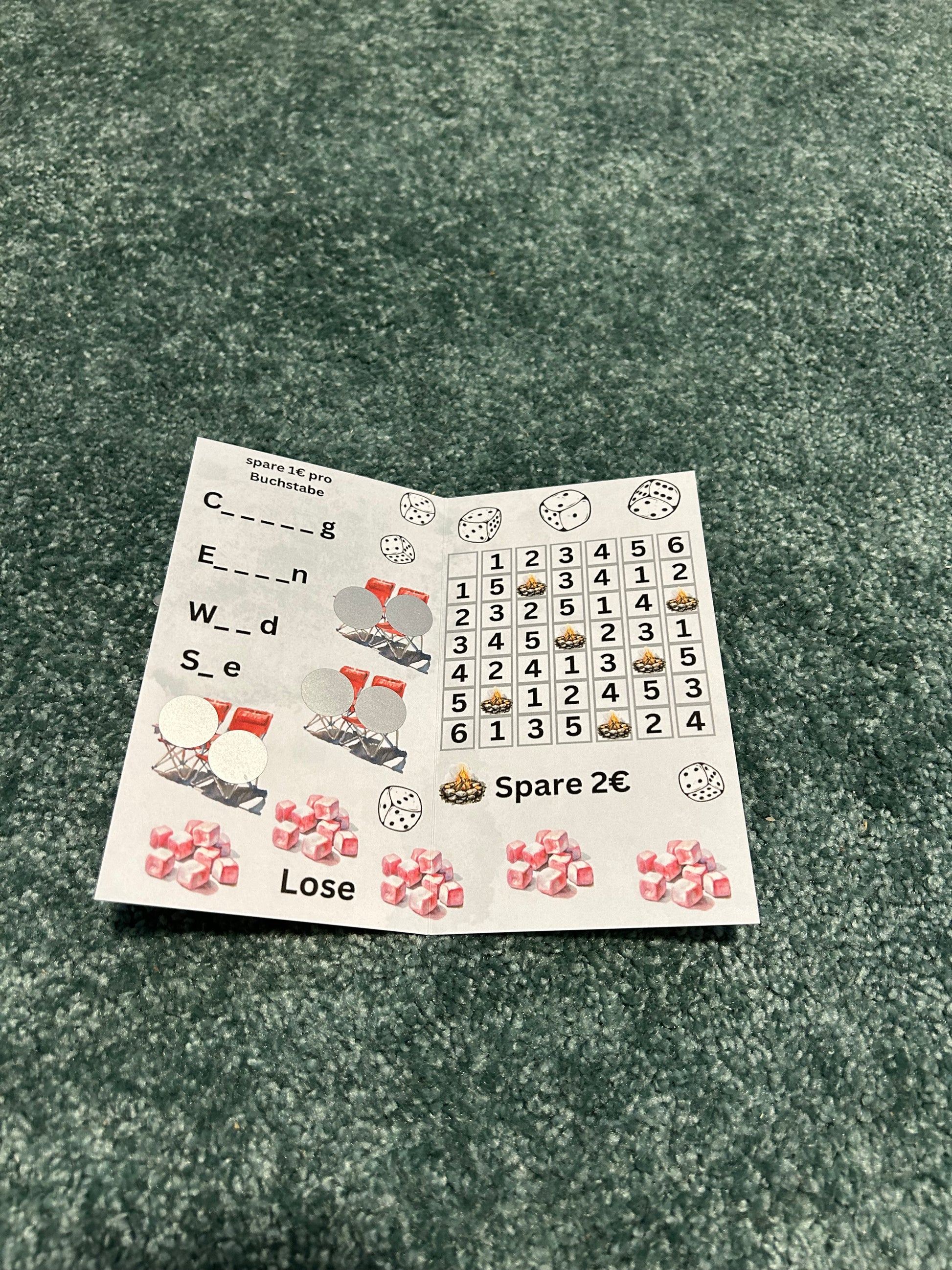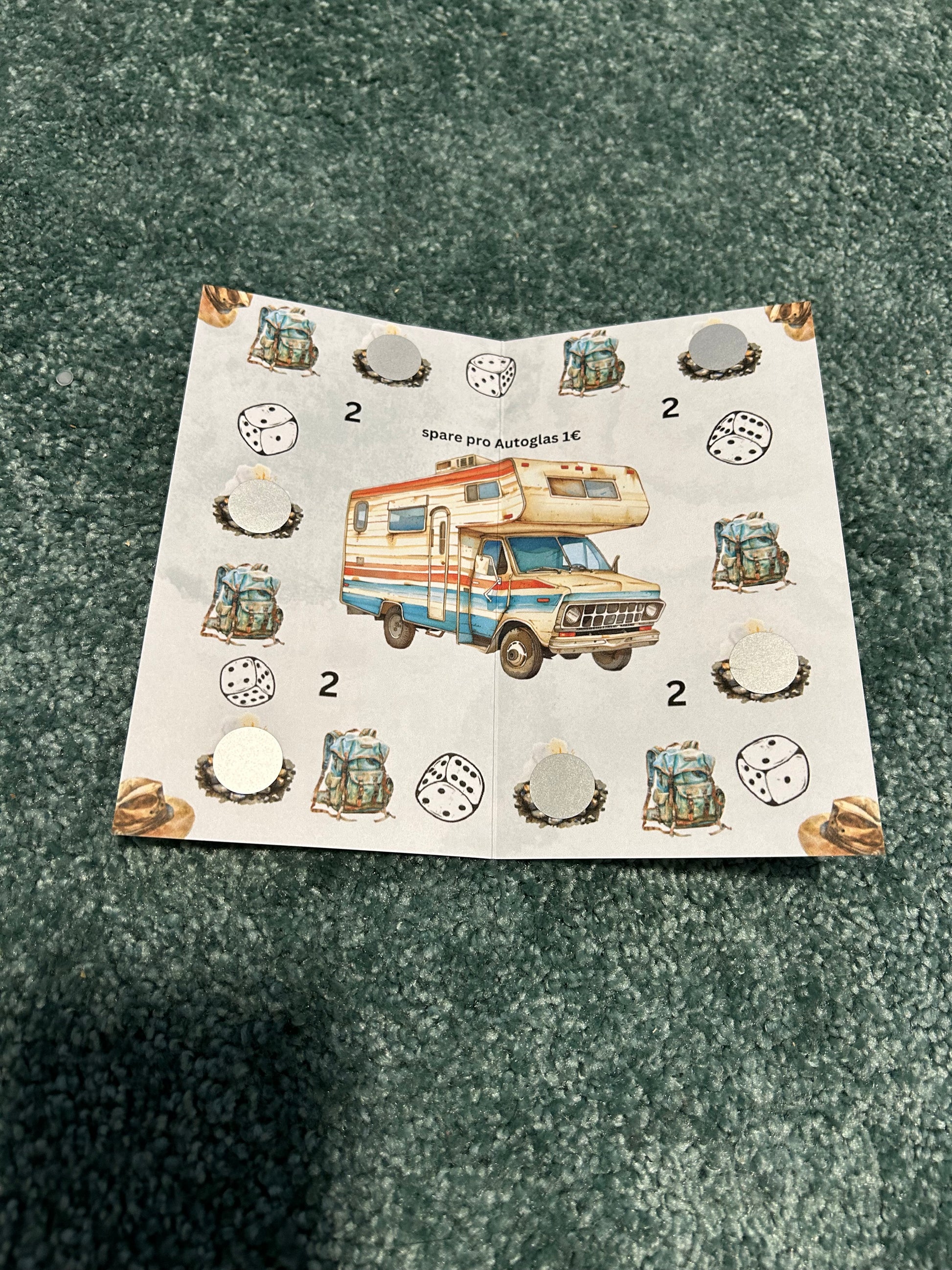 ein Set mit Dashboard, 2 Klappkarten und 3 einfachen Challenges zum würfeln, rubbeln ,abstreichen usw