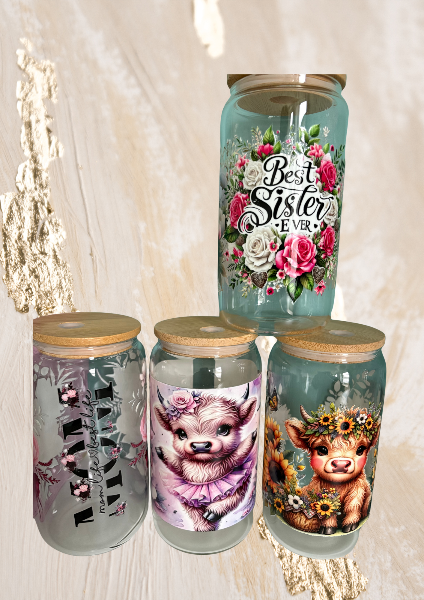 Becher und Strohhalm aus Glas mit verschiedene Motiven nicht Spühlmaschienen geeignet