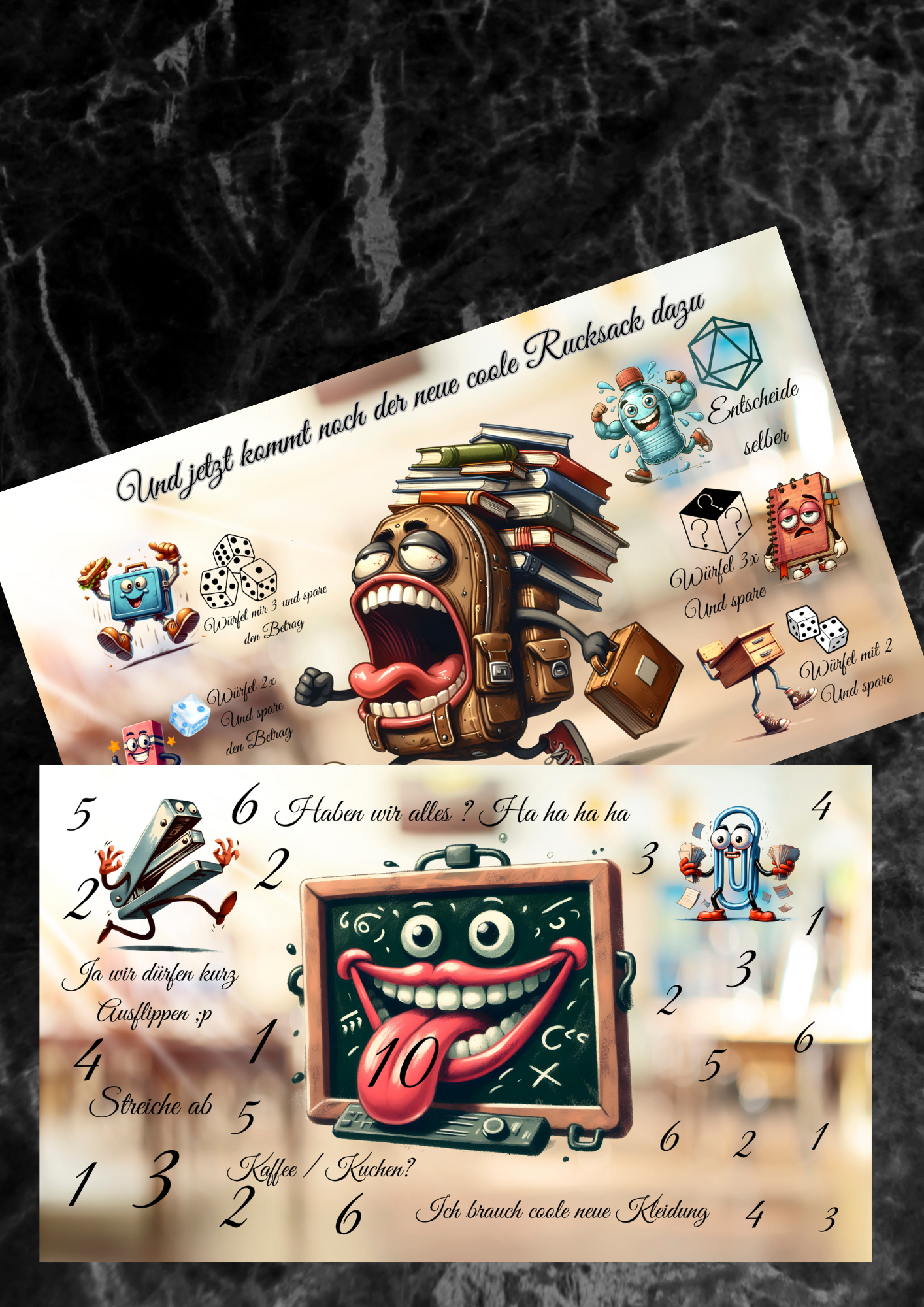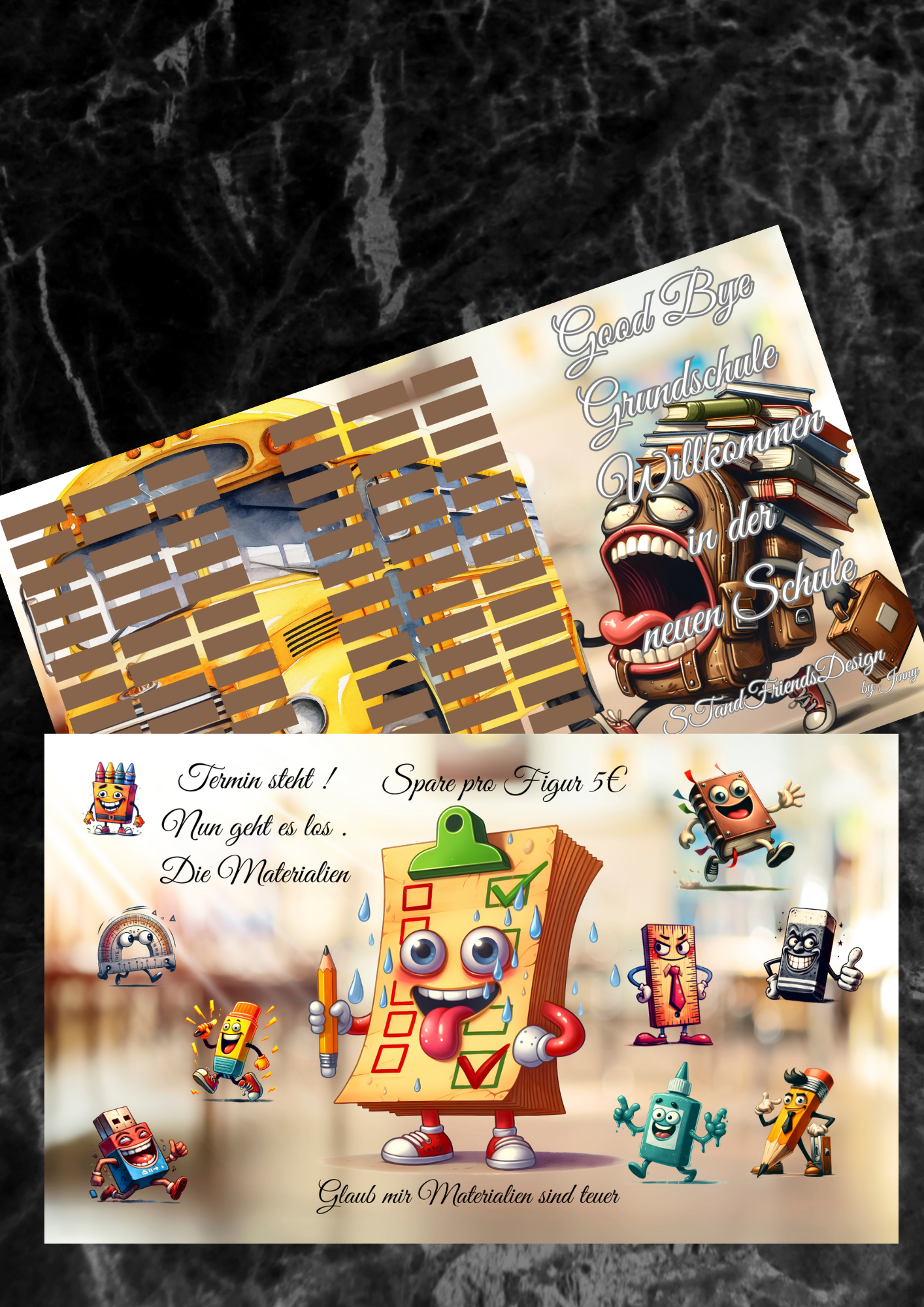 Es sind 2 3er Klappkarten zum sparen für alle neuen Sachen für die Schule aus der Druckerei auf 250g Papier gedruckt