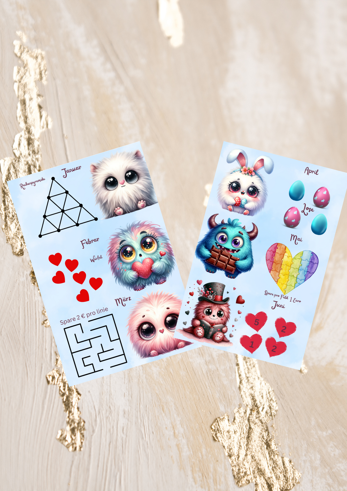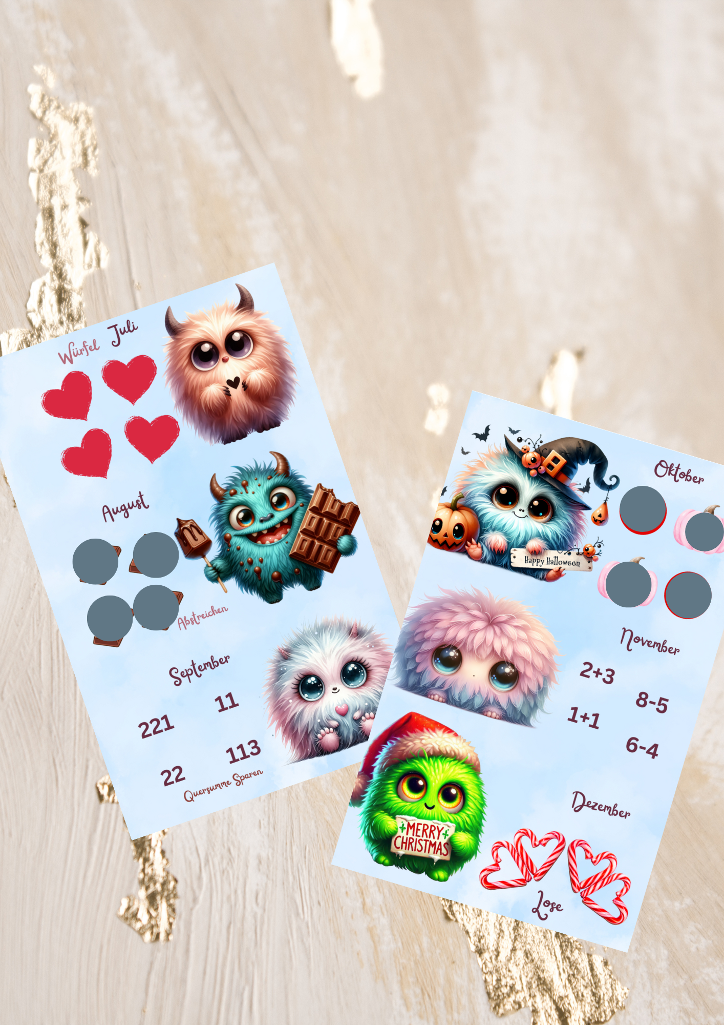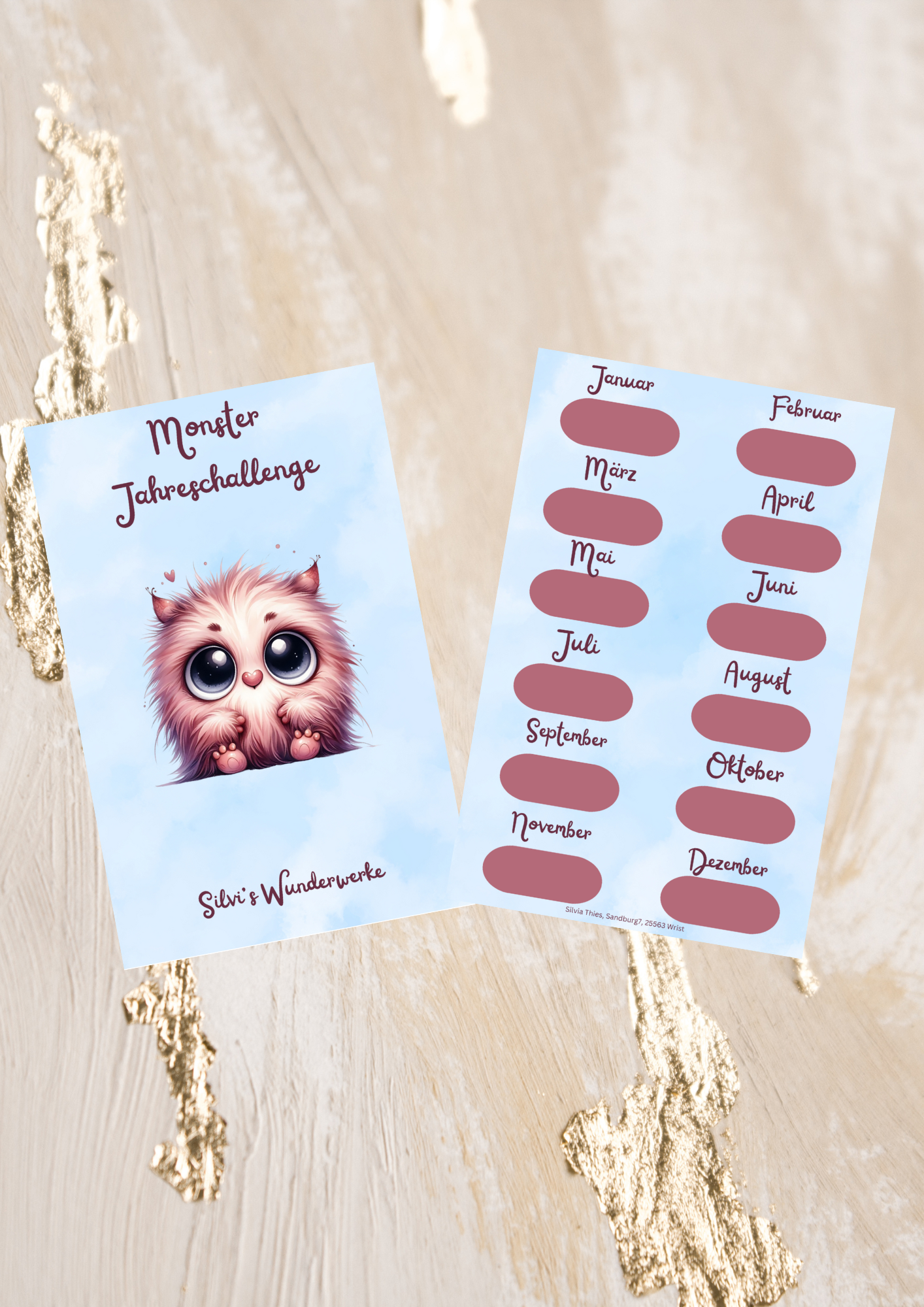 eine Jahreschallenge zum Einheften mit tollen aufgaben zb würfeln, rubbeln, lose usw