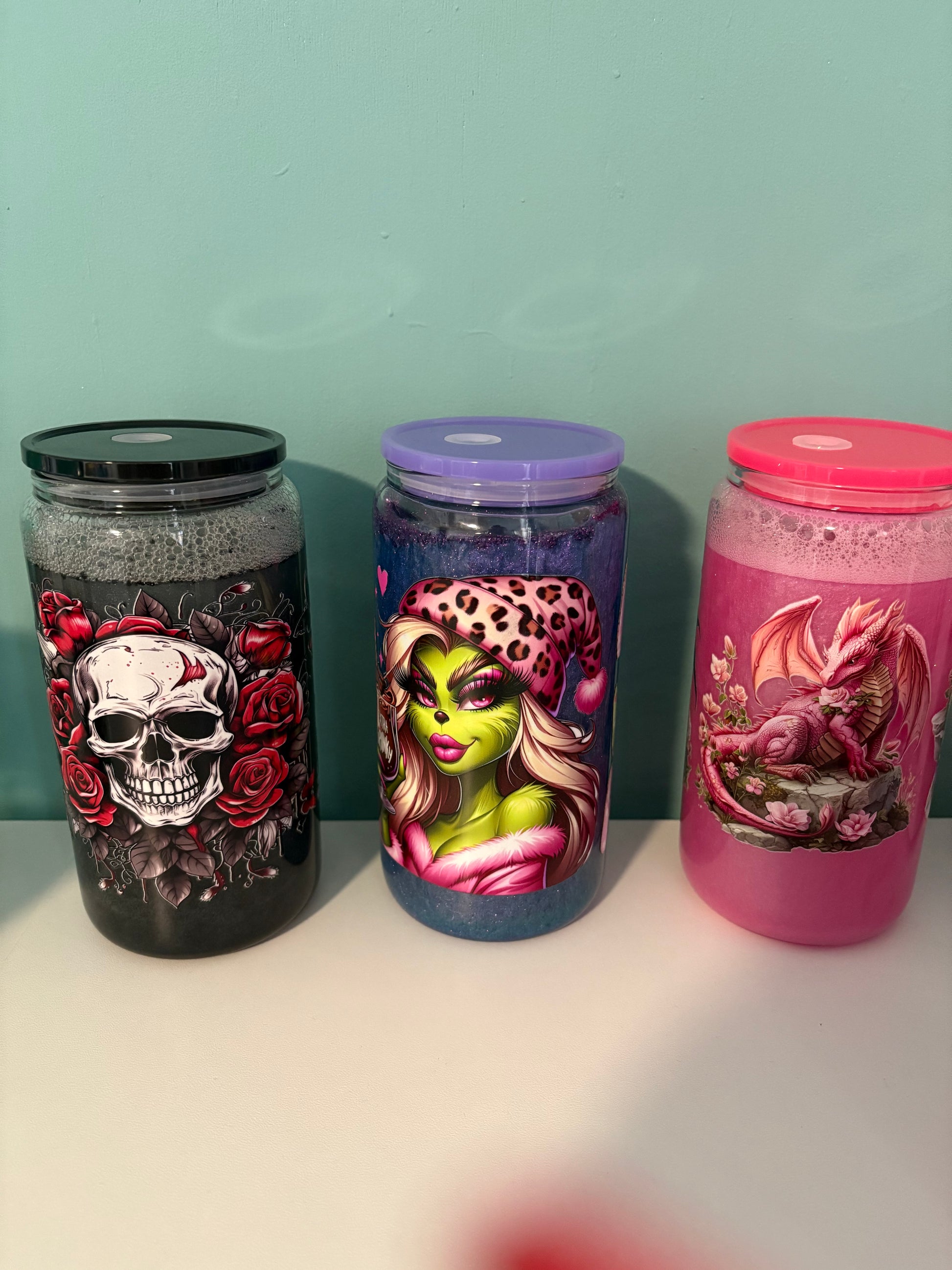 ein Becher aus Glas zum Schütteln dan verändert sich das innenleben mit Glitzer faben und UV DTF Motiven nicht Spühlmasschienen fest