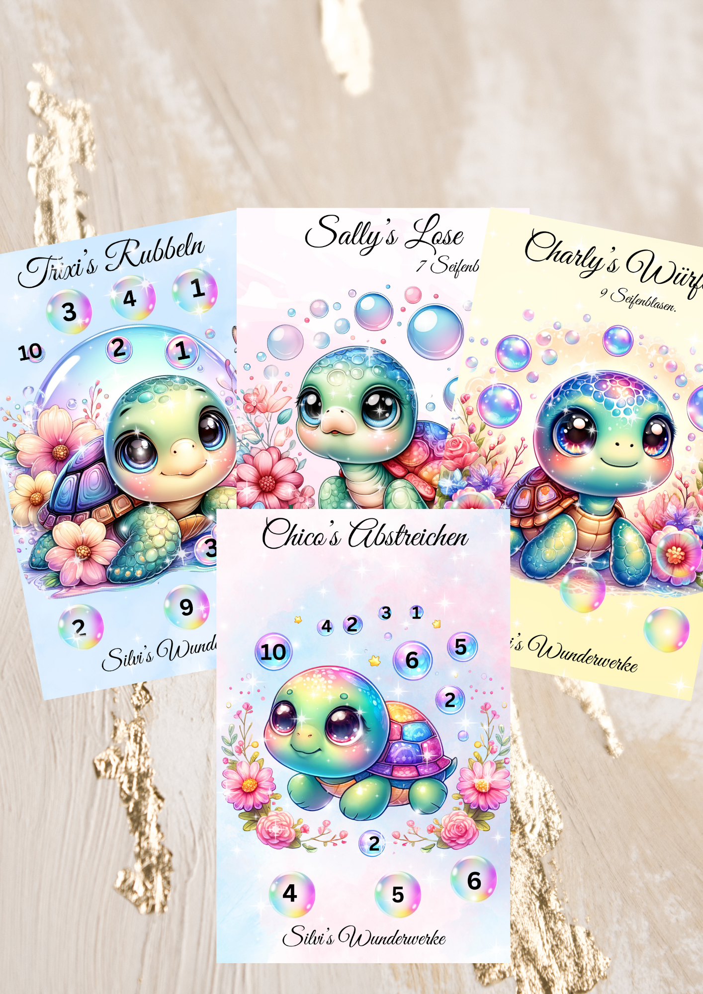 ein Set mit 4 einheftchallenges tracker auf der Rückseite zum losen, rubbeln, abstreichen und würfeln auf 250 g Papier gedruckt
