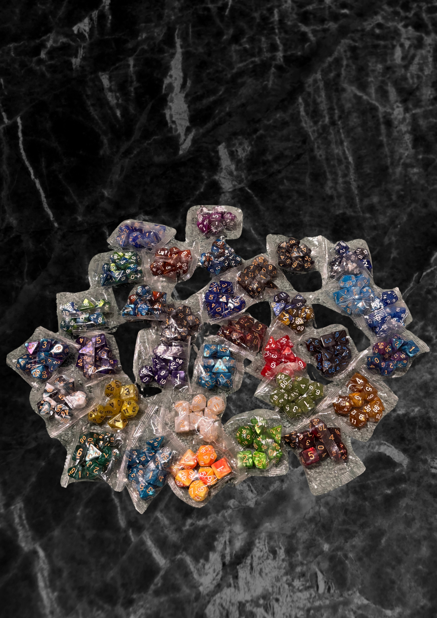 Hier habt ihr 7 Würfelpacks mit verschieden farben und Würfel vom 3er bis 20er sind alle dabei